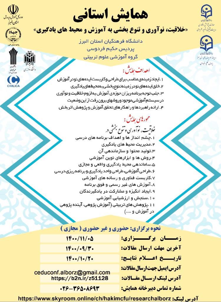 با سلام و احترام به اطلاع پژوهشگران، اعضای هیئت علمی، معلمان و دانشجو معلمان می رساند گروه علوم تربیتی و معاونت پژوهشی پردیس حکیم فردوسی در راستای ترویج و معرفی خلاقیت و نوآوری در امر مهم آموزش، تدریس، مدیریت و پژوهش در محیط های یادگیری را در اوایل بهمن ماه ۱۴۰۰ برگزار خواهد نمود و از این رو از کلیه علاقه مندان درخواست می شود خلاقیت و نوآوری و تنوع بخشی به آموزش و محیط های یادگیری خود را در قالب مقاله بر اساس آیین نگارش پیوست زیر به ایمیل ceduconf.alborz@gmail.com یا از طریق سایت http://b2n.ir/z51128 حداکثر تا پایان آذرماه ارسال فرمایند.