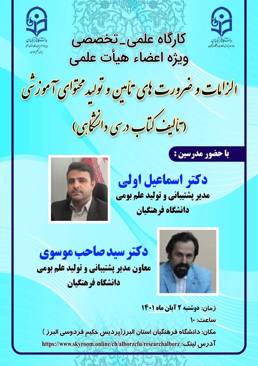 کارگاه علمی ـ تخصصی ویژه اعضای هیأت علمی با عنوان الزامات و ضرورت های نیاز و تولید آموزشی (تألیف کتاب درسی دانشگاهی ) با حضور جناب آقای دکتر اسماعیل اولی مدیر محترم پشتیبانی و تولید علم بومی دانشگاه فرهنگیان و جناب آقای دکتر سید صاحب موسوی معاون مدیر پشتیبانی و تولید علم بومی دانشگاه فرهنگیان مورخ یکشنبه 24 مهرماه 1401 در دانشگاه فرهنگیان استان البرز (پردیس حکیم فردوسی) به صورت حضوری و غیر حضوری برگزار می شود.به شرکت کنندگان در کارگاه گواهی نامه معتبر علمی تقدیم خواهد شد.