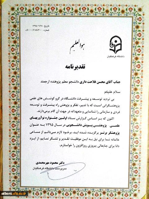 افتخار آفرینی آقای محسن فلاحتداری در نخستین جشنواره ملی نوآوری های علمی و پژوهشی دانشجو معلمان دانشگاه فرهنگیان 2