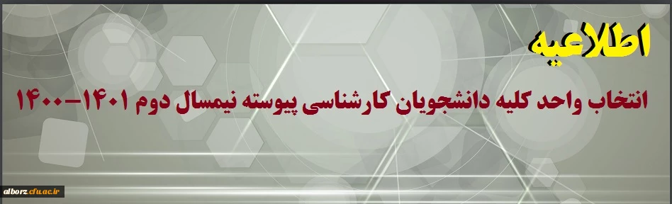 امتیاز دهید : انتخاب واحد کلیه دانشجویان کارشناسی پیوسته نیمسال دوم 1401-1400 2 پنجشنبه 14 بهمن 1400 ساعت 1:01