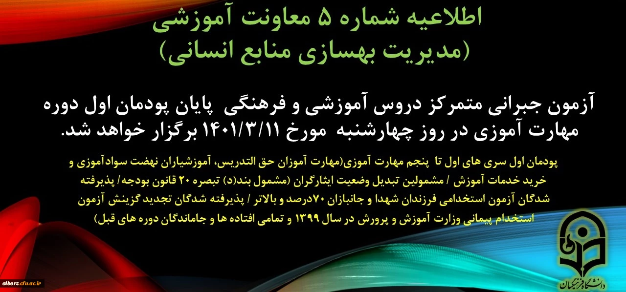 برگزاری آزمون جبرانی متمرکز دروس آموزشی و فرهنگی پایان پودمان اول سری های اول تا پنجم مهارت آموزی چهارشنبه 11 خرداد 2