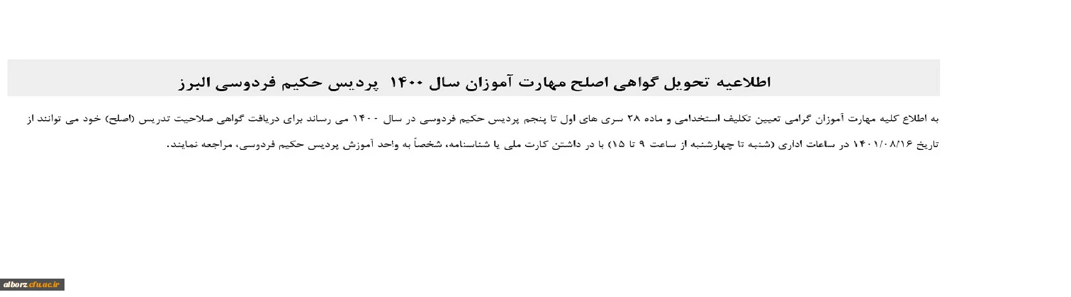 اطلاعیه تحویل گواهی اصلح مهارت آموزان سال 1400  پردیس حکیم فردوسی البرز 2