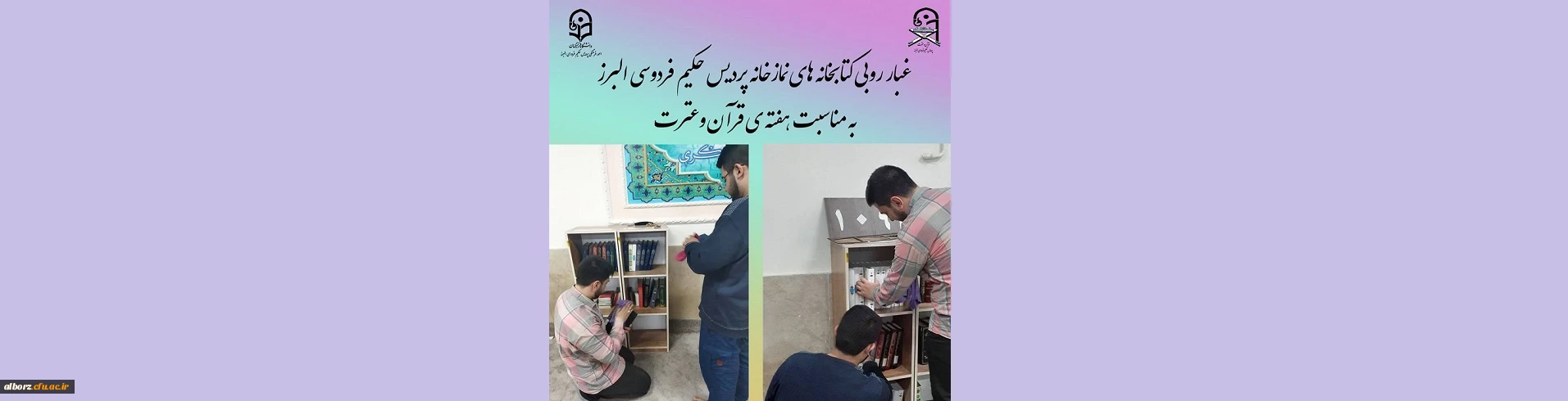به مناسبت هفته ی قرآن و عترت غبار روبی از کتابخانه های نمازخانه پردیس حکیم فردوسی انجام گرفت. 2