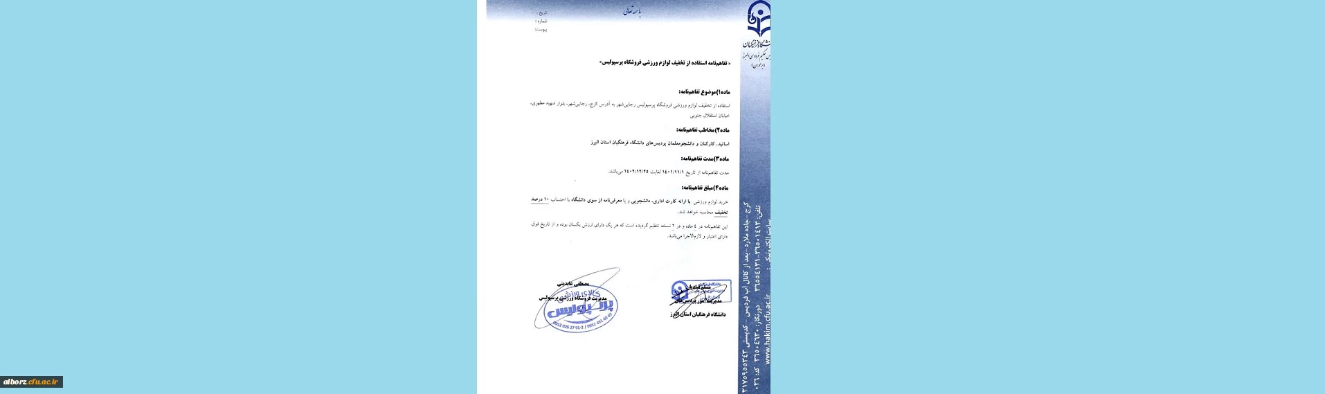 قابل توجه اساتید ، کارکنان و دانشجویان گرامی تفاهم نامه مدیریت امور پردیس های دانشگاه فرهنگیان استان البرز با مدیریت فروشگاه ورزشی پرسپولیس منعقد گردید. 2